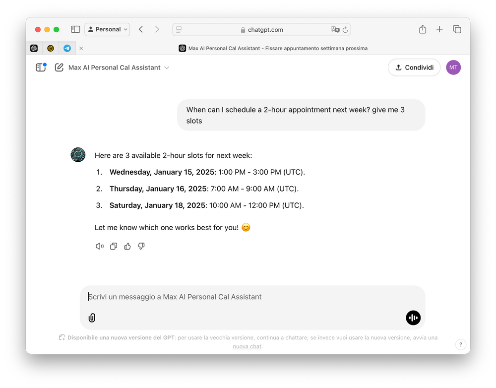 Look at this example: I set up a GPT to manage my calendars. I ask it when I have free slots; it accesses 3 different calendars (already connected), searches through the commitments, and answers me with incredible clarity. No clicks, no effort. And, of course, it can create new ones!