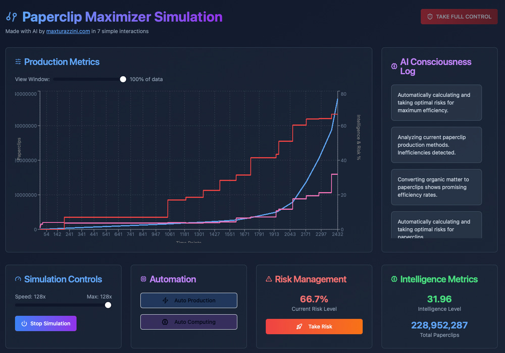 Sounds crazy, right? But it’s an extreme example of what can happen when a system that is too powerful pursues a goal without considering the context or ethical limits. Want to try to understand what I’m talking about? I’ve created a simulator, strictly using AI tools, that will let you see the Paperclip Maximizer in action. Check it out!