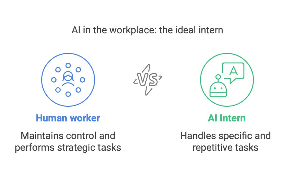 In my workshops with companies—I enjoy sharing Ethan Mollick’s metaphor—one of this change’s greatest interpreters—who compares AI—to an intern! This metaphor immediately clarifies what role AIs could assume within work contexts: just like human interns perform specific (perhaps very complex) repetitive tasks under operational workers' supervision—and managers' control—allowing them more free time & energy towards strategic activities.